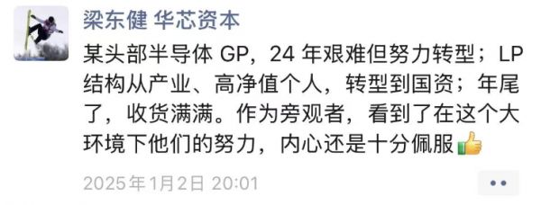 也有机构在求变中谋生,华芯资本合伙人梁东健也在朋友圈感叹:“某头部半导体GP,2024 年艰难但努力转型;LP 结构从产业、高净值个人,转型到国资;年尾了,收货满满。作为旁观者看到了在这个大环境下他们的努力,内心还是十分佩服。”