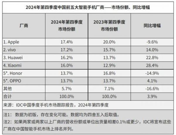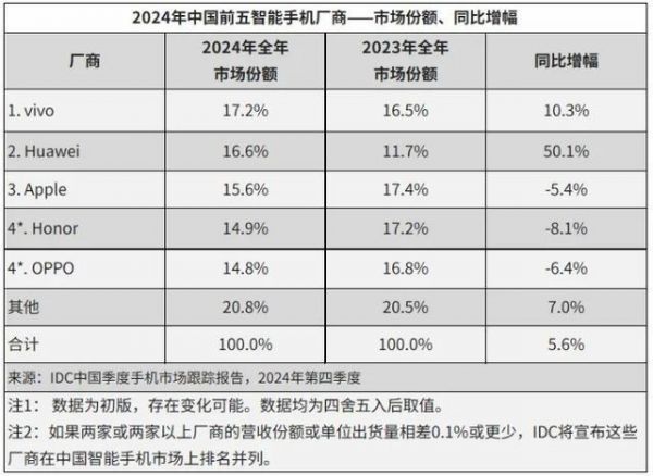在品牌竞争格局中,华为凭借其卓越的市场表现和强劲的增长动力,成功夺得市场份额榜首的宝座,占比达到16.6%。尤为值得一提的是,华为智能手机出货量同比大幅增长超过50%,远超其他竞争对手,成为市场中无可争议的领跑者。紧随其后的是vivo和苹果,分别占据了17.2%和15.6%的市场份额,尽管vivo也实现了10.3%的同比增长,但在华为耀眼的表现下仍稍显逊色。荣耀和OPPO则分列第四和第五位,市场份额分别为14.9%和14.8%,但这两家品牌的出货量在去年均有所下滑。