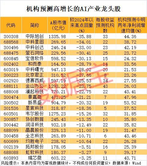 A股市场上,涉及AI产业链的概念股众多,本文以中证人工智能成份股(注:中证人工智能产业指数在为人工智能提供基础资源、技术以及应用支持的公司中,根据人工智能业务占比和总市值的综合指标,选取50家最具代表性公司作为样本股,反映人工智能产业公司的整体表现,为投资者提供新的投资标的)作为观察样本,筛选出成长潜力较高的龙头股。