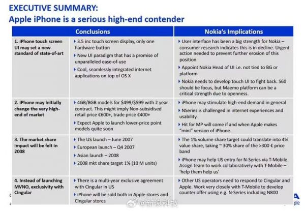 【档案披露:#诺基亚曾预警iPhone威胁未被高层重视#】最新披露的一份诺基亚内部档案显示,在初代 iPhone 发布后的第 2 天,至少有 9 名诺基亚员工就意识到其带来的巨大威胁,并提交了一份机密内部报告。
