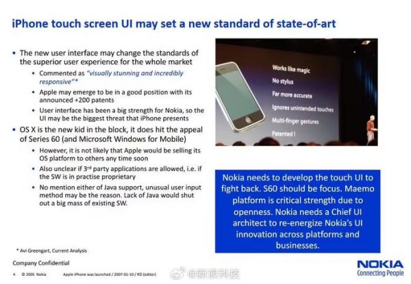 报告评价 iPhone 的 UI 为“视觉效果惊艳,响应速度极快”,建议诺基亚需要开发触摸 UI 来应对挑战,新的用户界面可能会改变整个市场对卓越用户体验的标准。