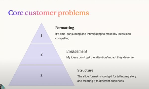 我们一开始就决定专注于演示文稿(PPT)。演示文稿是一种广泛存在的商业流程,我们几乎每周都会制作和参加演示。根据统计,几乎有 10 亿人每月制作演示文稿。虽然 Office 是一个巨大的商业市场,但构建、制作演示文稿的过程往往令人沮丧,设计幻灯片和组织内容会带来很大的压力,演示文稿的制作和观看过程也常常让人感到无聊、沮丧和疲惫。因此,我们希望能在这个领域进行创新。所以我实际上是在一个巨大的预设的问题上提出了这个想法,在这个问题上,人们对现有的解决方案并不满意。这就是我们来到这里的原因。