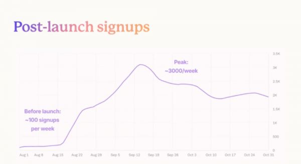 在 2021 年,我们通过在 TechCrunch 上发文获得了第一批用户。我们找投资人,让他们在 Twitter 上帮我们宣传。我们宣布了融资消息,并在 TechCrunch 上发表了一篇文章。只是放了一个简单的注册页面,除了一个酷炫的图片和一个注册表单之外什么都没有。结果,我们仅仅依靠投资人的宣传,就吸引了大约 1000 人注册了我们这个非常模糊的产品。这就像是说,『哇,这太酷了!』。但实际上,肯定不是那么回事。他们甚至都没见过我们的产品,但他们还是很好心地这么说了。