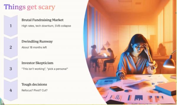 但即使我们处于这种不上不下的状态,周围的世界开始变得非常可怕。这是 AI 生成的一张压力很大的照片,,我喜欢这张我为演示而焦虑的照片。当时的融资市场已经从非常宽松转变为相当残酷和可怕。那是 2022 年末,到了 2023 年,利率飙升,我们开始裁员。然后,大概在一二月份,硅谷银行倒闭了,我们所有的钱都被冻结了,我们甚至不知道能不能按时发工资。我们的资金周转开始变得紧张。