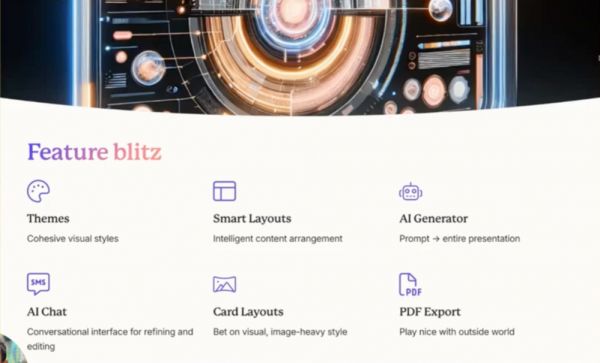 但现在,你可以使用不同的主题来可视化地设计你的演示文稿。我们有了便捷的智能布局,也就是你在这里看到的带有图标的那个。我们有了一个 AI 功能,可以根据你的提示构建演示文稿,这个功能最初只是一个原型。我们实际上在产品中保留了一个 AI 聊天功能,你可以说,请帮我重新设计一下。我们还有了卡片式布局,也就是你在这里看到的图片,幻灯片上会有一张醒目的图片。