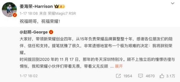 2025年1月17日,荣耀终端股份有限公司发布公告官宣赵明辞职,同时赵明本人也发长文告别荣耀。现据最新消息,荣耀终端股份有限公司中国区CMO姜海荣似乎也将离职。