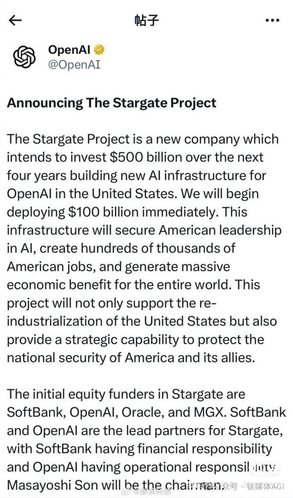 特朗普和OpenAI同时表示,Stargate Project这一基础设施将确保美国在 AI 领域的领导地位,“几乎立即创造10万个美国就业岗位”,并为全球带来巨大的经济效益。该项目不仅将支持美国的再工业化,还将提供保护美国及其盟友国家安全的战略能力。