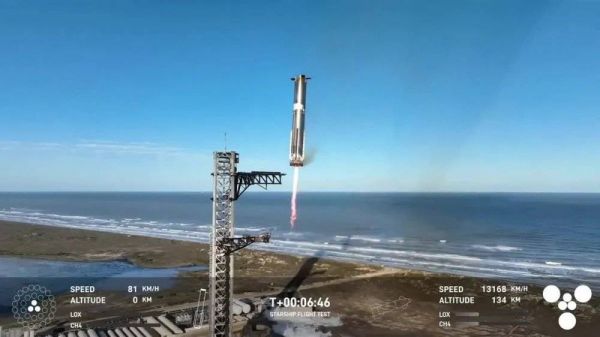 图3 星舰第七次飞行筷子夹箭回收第一级(图源:SpaceX)