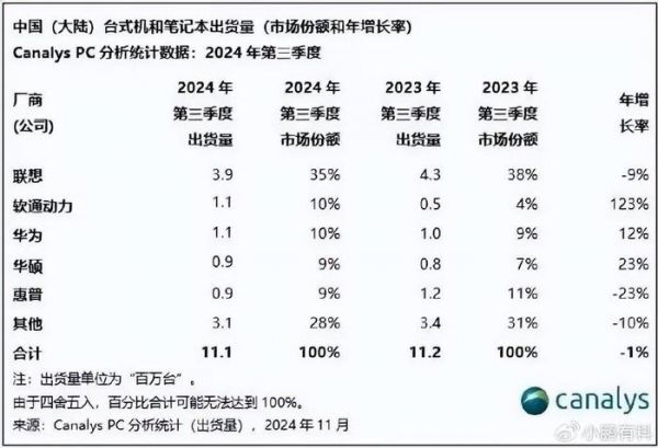 PC销量:联想全球和中国都第1,华为中国第3,全球其它