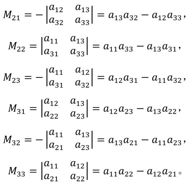 我们以3阶方阵为例演示上述逆矩阵公式。这时,