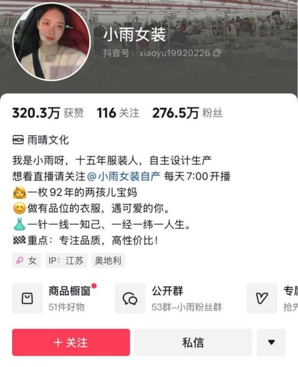 例如,拥有276万粉丝的抖音账号“小雨女装”,去年下半年与MCN机构雨晴文化签约。股权穿透显示,这家公司由三只羊实际控股。2024年10月底开始,小雨女装直播了约20天,累计1960万人观看,带货超1亿元,大约相当于小杨哥的1/5。