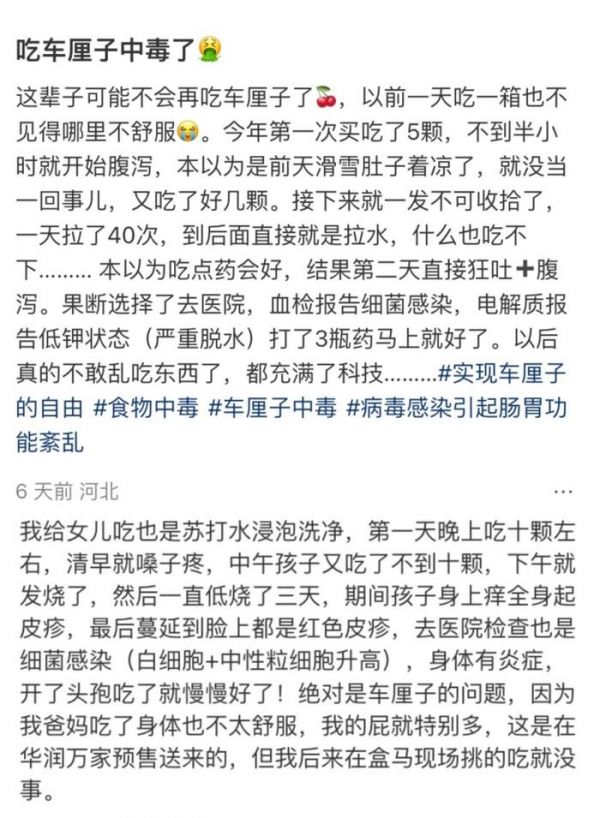 大部分消费者根本没有精力去细究这些食品安全传言的真实性的。有的消费者不在乎这些留言正常按需吃喝,有的本着宁可信其有的原则直接把车厘子打入冷宫,还有的是吃了车厘子吃出问题刚好被指明了“罪魁祸首”,所以刚好来骂一骂……