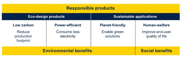 ST在2011年启动了可持续技术计划。该计划覆盖全球,呼吁在新产品和新技术的开发阶段兼顾可持续性,并为公司、客户和社会创造价值,在产品每个阶段都采用了生命周期方法,从负责任的采购到报废。ST的可持续技术计划将产品分为四类提供环境和社会效益的“负责任产品”,包括低碳、高效、地球友好以及人类友好四大方向。