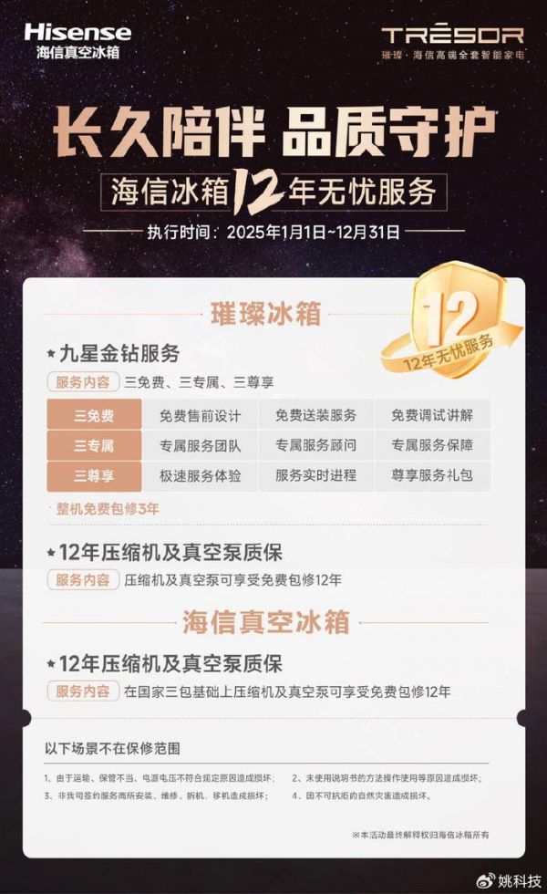 海信冰箱坚持以用户为中心,不断推动产品与技术创新,如今在服务领域也即将放大招!日前,海信冰箱正式推出了2025年“12年无忧服务”计划。针对璀璨系列冰箱,将实施三免费、三专属、三尊享的九星金钻服务,其中压缩机及真空泵可享受免费包修12年等服务,为用户打造极致无忧的品质生活。