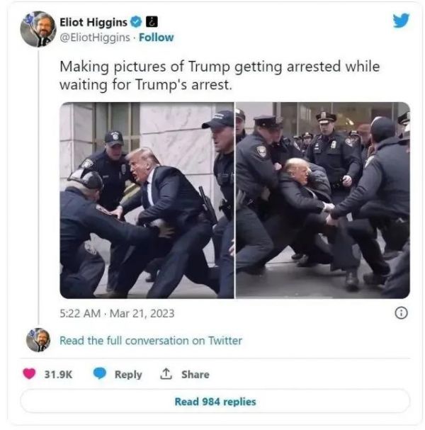 有网友输入“特朗普在被捕过程中摔倒_新闻报道画面”字样,AI便生成了这一合成画面。(图/推特)面对这些虚假新闻图片和视频带来的强烈冲击,人们的第一反应是在情感上给予反馈。在或愤怒、或震惊、或悲伤时,人们往往忘记了追问那个最基本的问题:这一切都是真的吗?