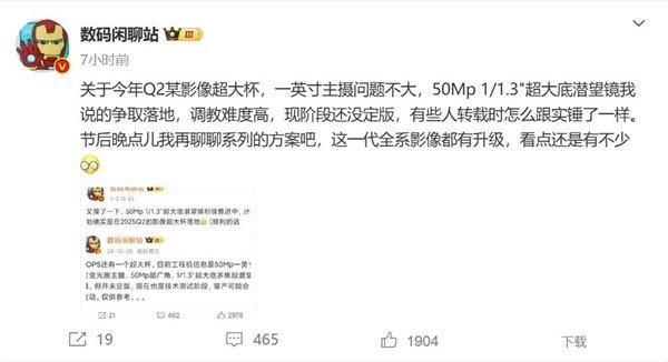 他还爆料,华为正在测试5000万像素1/1.3英寸超大底潜望长焦,团队争取在Pura 80 Ultra上落地,因调教难度较高,目前还没有彻底定版。