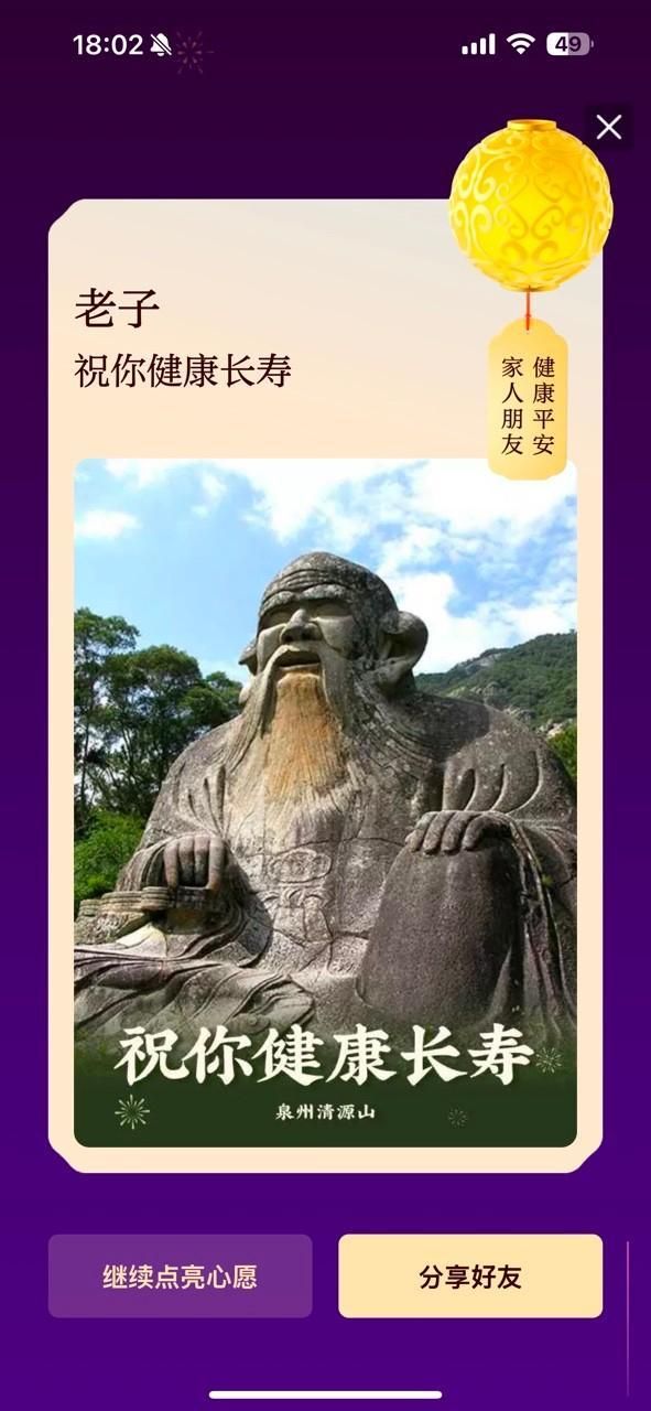 今年,包括国家民委道中华平台、中国警察网、中国石化、各地景区在内的社会各界也都来淘宝上帮助大家实现心愿,为全国网友送祝福。其中,来自泉州清源山景区的“老子祝你健康长寿”最受欢迎,引来众多网友接龙“接健康运”。