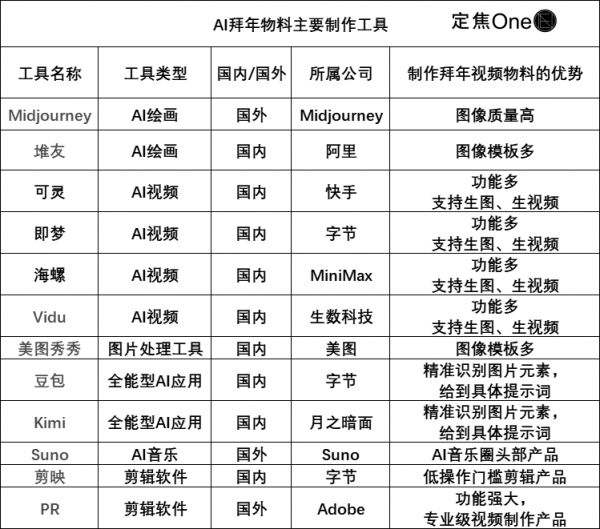 需要指出的是,目前没有一款工具能同时具备图片检索、生图、生视频、生音乐、剪辑所有需求,也就是说,上述任何一款工具都无法单独完成一条拜年视频。
