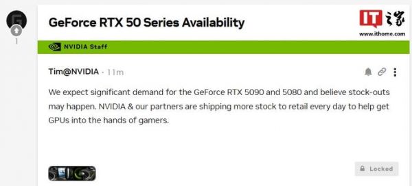 1 月 28 日消息,英伟达论坛官方人员今日发布公告,预计 GeForce RTX 5090 和 5080 的需求量很大,并认为可能会出现缺货。“英伟达和我们的合作伙伴每天都在向零售商运送更多的库存,以帮助将 GPU 送到游戏玩家手中。”