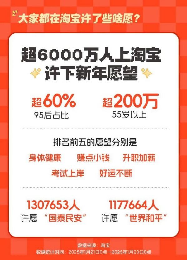 上线短短两天时间,便有超过6000万人在淘宝许下了新年愿望。人们许下的新年愿望中,既有独善其身的“赚点小钱”、“升职加薪”,又有兼济天下的“国泰民安”、“世界和平”。