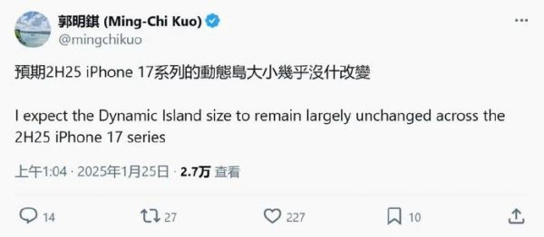 如果这一设想能够实现,无疑将进一步提升手机的屏占比。更大的屏幕显示区域,无论是观看视频、畅玩游戏,还是进行多任务处理,都将更加得心应手。然而,就在近日,知名苹果分析师郭明錤却泼来了一盆冷水,发表了截然不同的看法。他明确表示,下半年发布的iPhone 17系列,灵动岛尺寸几乎保持不变。这意味着,苹果或许无缘“灵动小岛”,iPhone 17系列机型的灵动岛将依然采用与现款iPhone相同的尺寸。