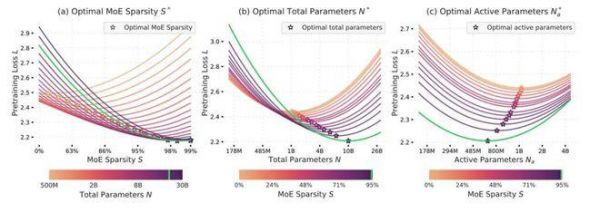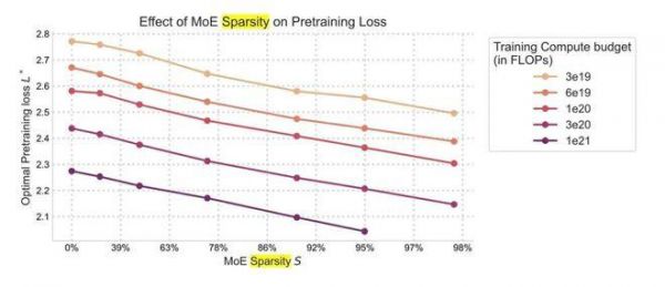 其在论文中表示,在增加稀疏性的同时,当按比例地扩大参数总数时,那么即使在固定训练计算预算的限制下,也能持续降低预训练损失(预训练损失指的是神经网络的准确度。一般来说,训练损失越低,结果越准确)。