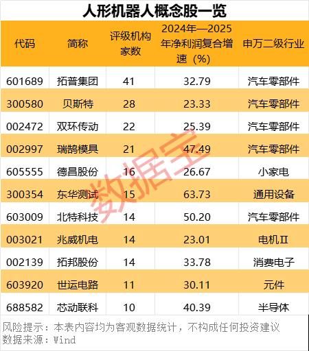 如,拓普集团获41家机构一致预测2024年—2025年净利润复合增速为32.79%,公司拟50亿元投资机器人电驱系统基地,电驱系统为人形机器人主要部件;研发的机器人核心部件直线执行器和旋转执行器已经多次向客户送样,获客户一致好评。