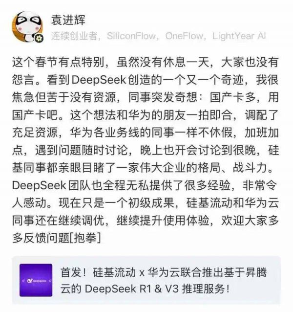 硅基流动创始人、CEO袁进辉在社交媒体也透露了合作开发过程。