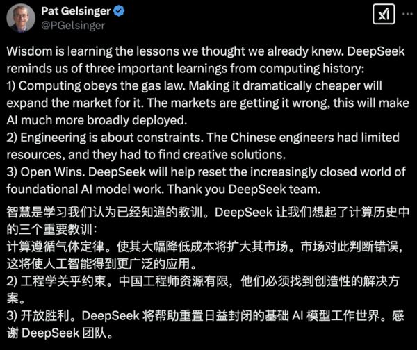 前英特尔CEO Pat Gelsinger也在X上对DeepSeek赞赏有加,并从中提炼出计算机发展史上的三个重要经验:其一,计算领域遵循“气体定律”,成本的显著降低必然带来市场扩张,而市场低估了这一点;其二,中国工程师在资源受限的情况下找到创造性解决方案,印证了工程的本质即解决约束;其三,开放策略终将胜出,DeepSeek的做法将有助于重塑日益封闭的AI基础模型领域。Gelsinger对DeepSeek团队表达了感谢,认为他们的实践将对整个AI行业产生深远影响。