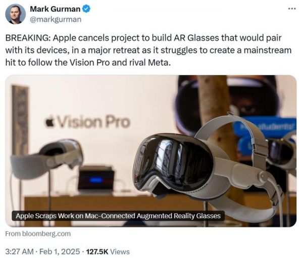 【#苹果取消与Meta竞争的AR眼镜项目# 】