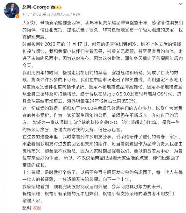 赵明发文!告别10年荣耀