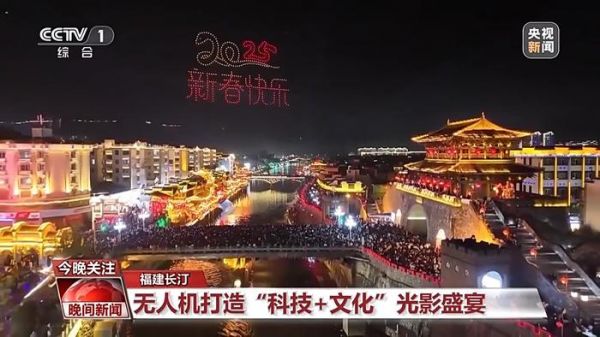 在福建龙岩的长汀古城,当夜幕降临,千台无人机缓缓升空,不仅呈现出蛇年“福”文化的不同图案,还以长汀古城的历史建筑为背景,呈现出一系列代表古城元素的图案,为市民和游客营造了浓厚的节日喜庆氛围。