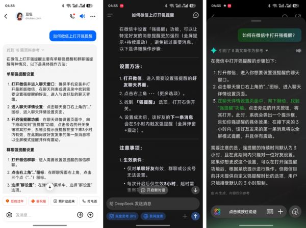 在一些软件级别的问题,例如“如何微信上打开强提醒”“怎么取消自动付款”等需求,目前包括豆包、DeepSeek以及手机自带的AI助手服务都能返回正确且详细的设置步骤,已经完全能代替我教会长辈,大大减轻我的压力。