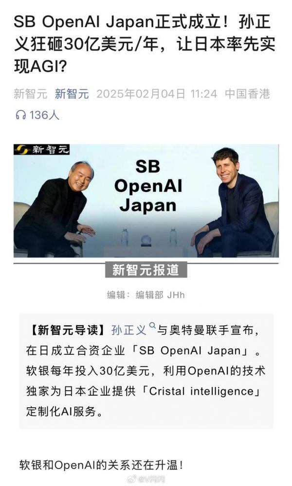 孙正义与奥特曼联手宣布,在日成立合资企业「SB OpenAI Japan」。软银每年投入30亿美元,利用OpenAI的技术独家为日本企业提供「Cristal intelligence」定制化AI服务。