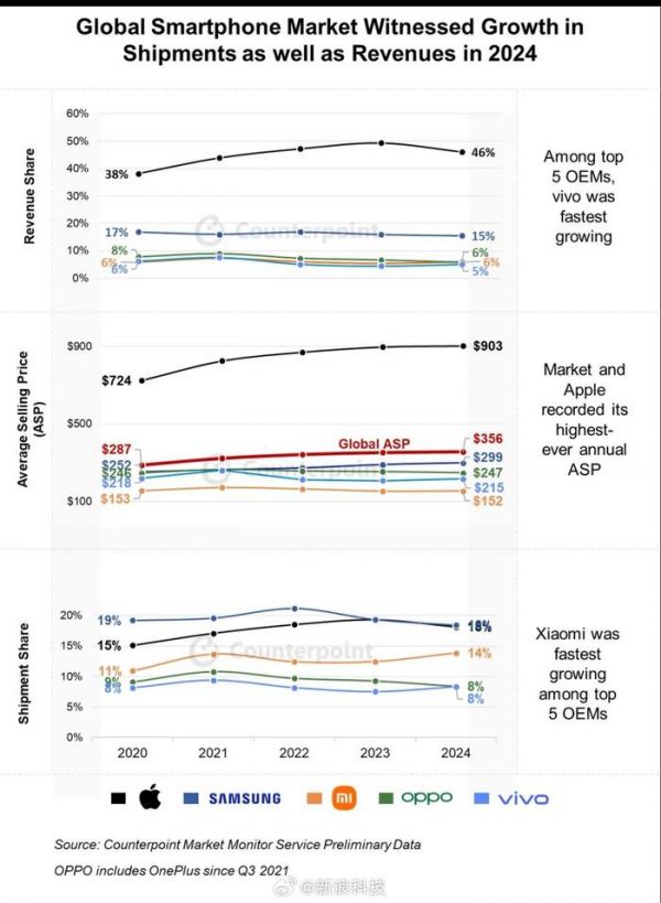 【2024年#全球智能手机平均售价创新高#】根据Counterpoint 市场监测服务的最新研究,2024年全球智能手机收入同比增长了5%,结束了连续两年的下降趋势,同时平均销售价格攀升至创纪录的356美元。此外,由于全球宏观经济状况改善,消费者信心提升,受 5G 技术普及以及更强的摄像头、更快的处理器等因素推动,手机换代需求增加,全球智能手机出货量在经历了两年的下滑后实现了增长。