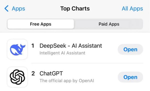 1月27日,DeepSeek应用登顶苹果美国地区应用商店免费App下载排行榜,在美区下载榜上超越了ChatGPT。同日,苹果中国区应用商店免费榜显示,DeepSeek成为中国区第一。