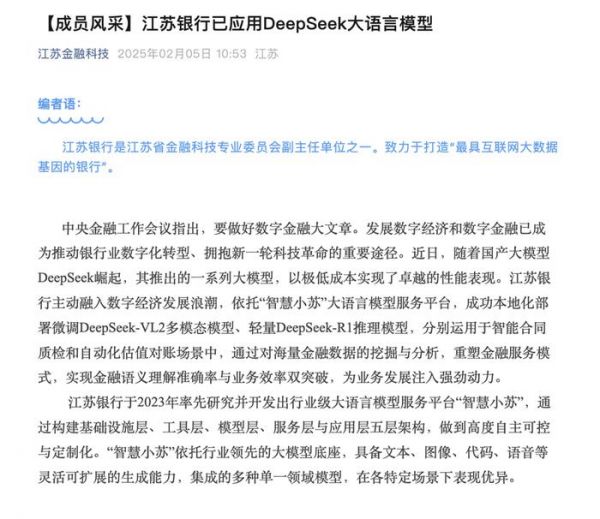 2月5日,江苏省金融业联合会金融科技专业委员会主办的“江苏金融科技”发布消息称,江苏银行依托“智慧小苏”大语言模型服务平台,成功本地化部署微调DeepSeek-VL2多模态模型、轻量DeepSeek-R1推理模型,分别运用于智能合同质检和自动化估值对账场景中,通过对海量金融数据的挖掘与分析,重塑金融服务模式,实现金融语义理解准确率与业务效率双突破,为业务发展注入强劲动力。