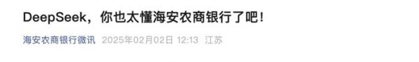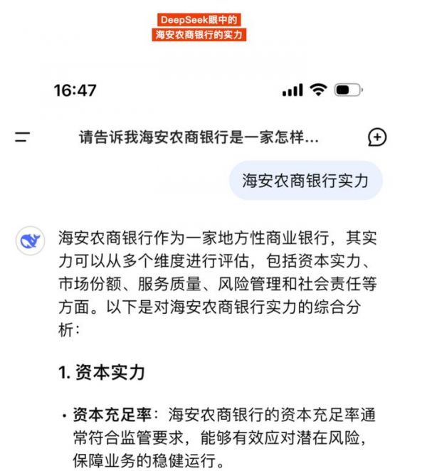 还有银行将DeepSeek运用到日常的营销宣传中,如海安农商银行于2月2日发布名为《DeepSeek,你也太懂海安农商银行了吧!》的文章,通过询问DeepSeek的方式,向用户具体介绍了该银行多方面情况,包括资本实力、市场份额、金融产品、社会责任等。