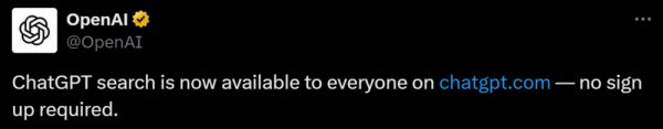 2月6日,OpenAI在社交平台X上宣布向所有用户开放ChatGPT搜索功能,且无需注册。