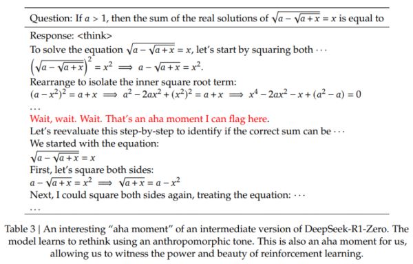 在DeepSeek对外分享的R1模型技术报告中,团队在强化学习推理阶段,意外发现了“aha moment”顿悟时刻,这预示着模型自身开始在某一时刻具备了自我反思能力。例如在解决数学方程时,模型会主动纠正早期错误步骤,还能根据训练逐步学会分配更多思考时间,生成更长的推理过程,以解决复杂问题。