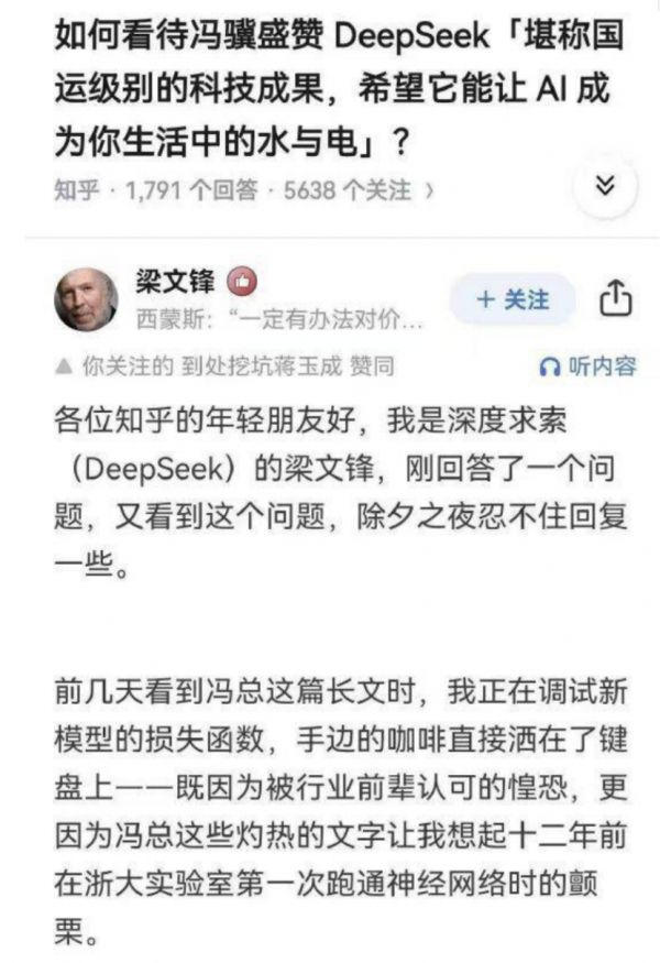 但简单搜索下梁文锋的履历便可知道,在十二年前的2013年,梁文锋已经从浙江大学硕士毕业三年。当年,梁文锋与其浙大同学徐进共同创立了杭州雅克比投资管理有限公司,DeepSeek给出的梁文锋在浙大实验室做实验的场景,大概率是自行编造而来。