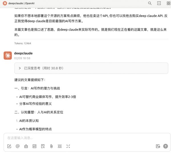 这是我朋友开源的项目(github.com/ErlichLiu/DeepClaude),我认为是目前最强的AI写作方案。如果你不想自己部署这个开源方案,也可以找他购买DeepClaude API。