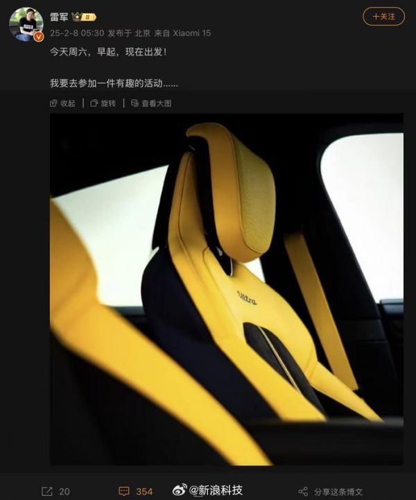 #雷军清晨晒照#【#雷军清晨晒SU7Ultra内饰照#,称“早起出发参加一件有趣的活动”】小米雷军今天 5 点 30 分发布微博,配文称“今天周六,早起,现在出发”、“我要去参与一件有趣的活动”,不过其并未透露具体活动内容。而在配图中,雷军展示了小米 SU7 Ultra 的内饰照片,暗示相应活动于 SU7 Ultra 有关。