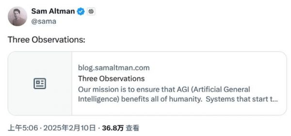 今天凌晨,OpenAI 联合创始人兼首席执行官 Sam Altman 在其个人博客发布重磅文章《Three Observations》,再次宣告通用人工智能(AGI)时代临近,更以“三大观察”为核心,提出了关于 AI 经济学的“三大观察”:AI 模型的智能水平与训练资源呈对数关系;使用特定水平 AI 的成本每 12 个月下降约 10 倍;以及线性增长的智能将创造超指数级的社会经济价值。