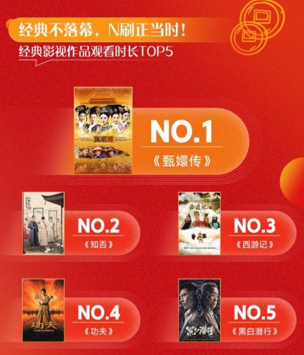 《甄嬛传》《知否知否应是绿肥红瘦》《西游记》成为优酷经典影视作品观看时长前三名。企业供图整体来看,长视频平台大屏观看时长在春节期间有明显提升。根据平台公开数据,今年春节假期八天,爱奇艺大屏端用户观看时长较节前一周增长13.7%;1月22日至2月2日期间,优酷用户观看时长环比提升18.82%,七成以上时间使用大屏观看。