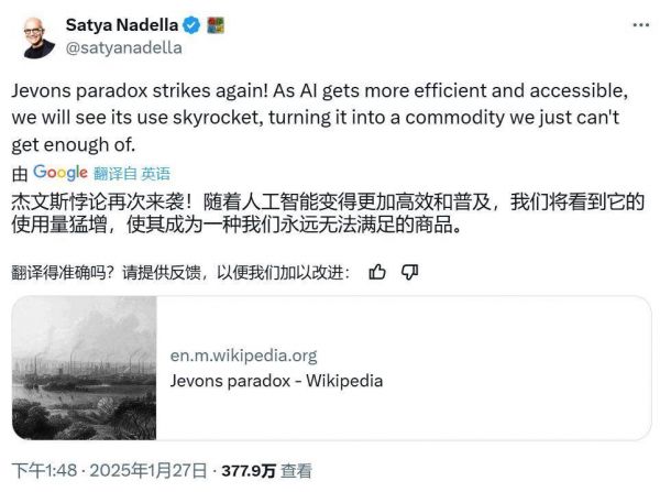 而微软的 CEO 此前也在 X 上发博转发了维基百科的“杰文斯悖论”词条来表示他的态度。