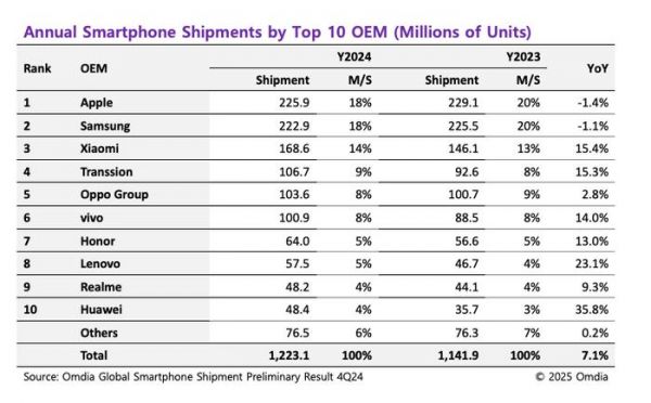近日,市场调研机构Omdia发布了2024年全球智能手机市场初步出货量报告。