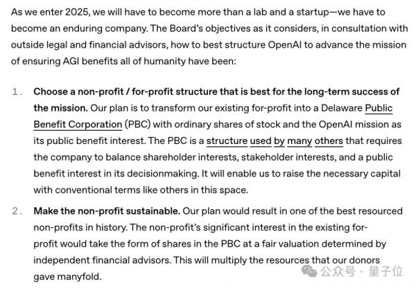 具体的计划是让OpenAI现有的营利性组织,转变为特拉华州的公共利益企业,即PBC。