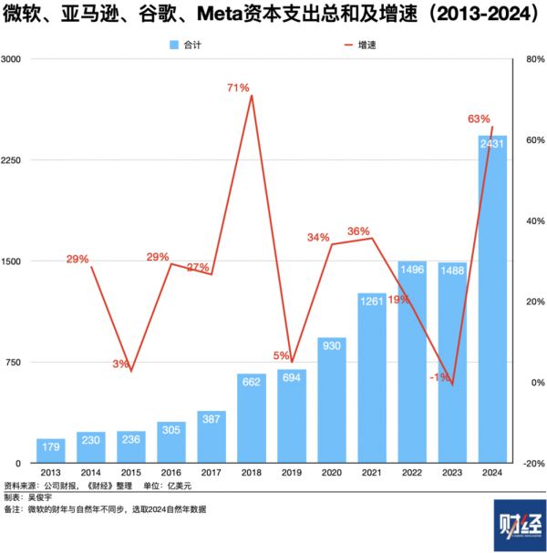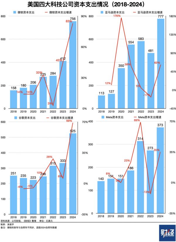 2024年,美国科技四巨头资本支出均达到史上最高点。最新财报显示,微软、亚马逊、谷歌、Meta 2024年资本支出分别是756亿美元、777亿美元、525亿美元、373亿美元,同比增长83%、62%、63%、35%。这四家公司2024年资本支出总额2431亿美元(约合1.8万亿元),同比增长63%。