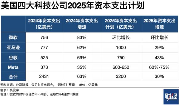按照微软、亚马逊、谷歌、Meta财报电话会披露的数据,美国科技四巨头2025年资本支出总额将超过3200万美元,总增速约为30%(约合2.3万亿元)。